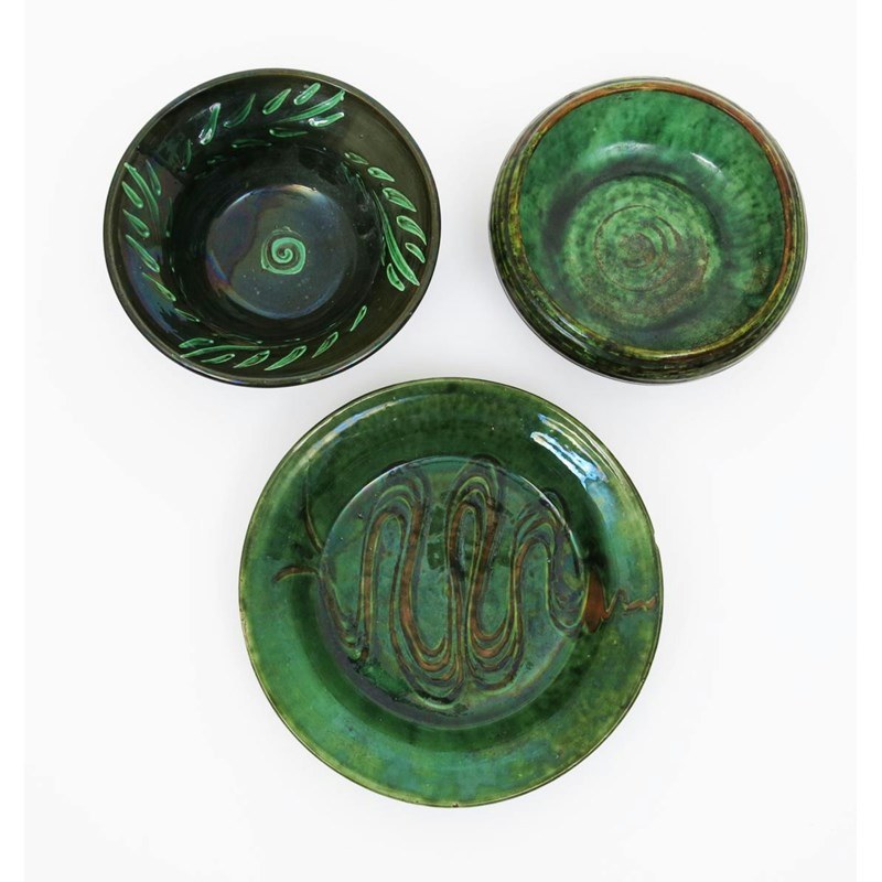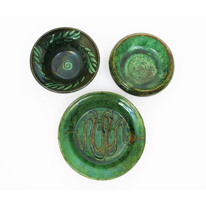 A Fremington Pottery charger, decorated with a simple brush design in ochre on a green ground, and two bowls incised marks, chip to rim, 29cm. diam.