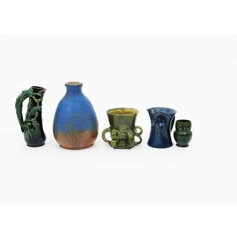 A Ruskin Pottery vase by William Howson Taylor, shouldered form covered in a matt blue glaze, two Owl jugs probably retailed by Liberty and made by Farnham Pottery, and a collection of studio pottery impressed marks, 25cm. high