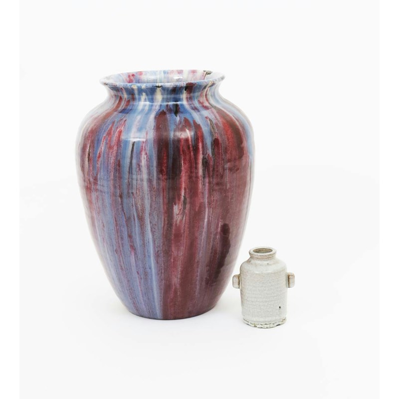 a large Coldrum Pottery vase, covered in a streaked blue and pink glaze, and another smaller Soon vase with lug handles impressed mark, repaired rim, 31cm. high