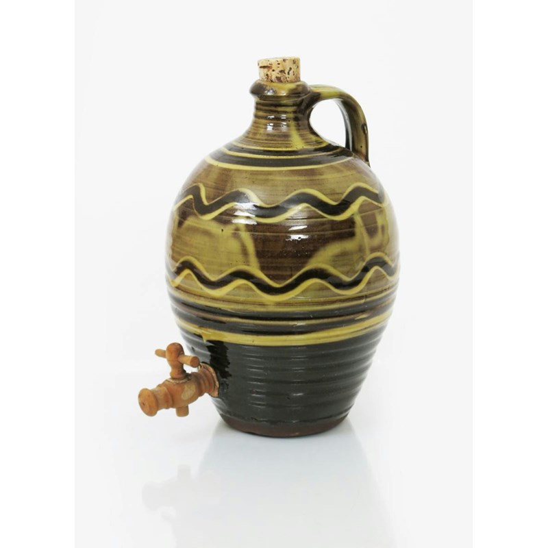 a Winchcombe Pottery stoneware cider jar, with wooden tap and cork bung, painted with combed decoration impressed seal mark, 33cm. high
