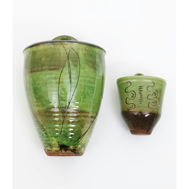 a Winchcombe Pottery wall pocket, incised with simple grass design in resist, glazed green, and another smaller impressed seal marks, 22.5cm. high (2)