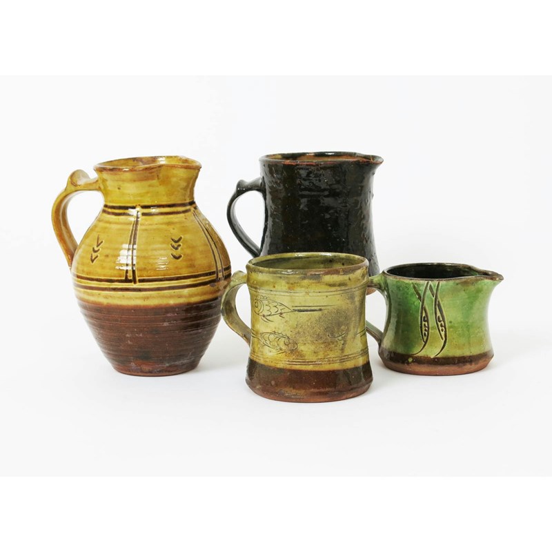 a Winchcombe Pottery tankard, incised with fish, glazed yellow-green, another mug and three jugs impressed Winchcombe seal mark. hairline crack 11.5cm. high (5)