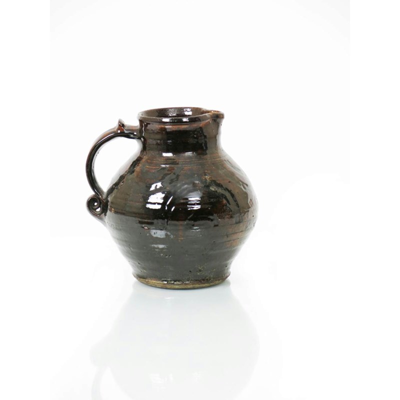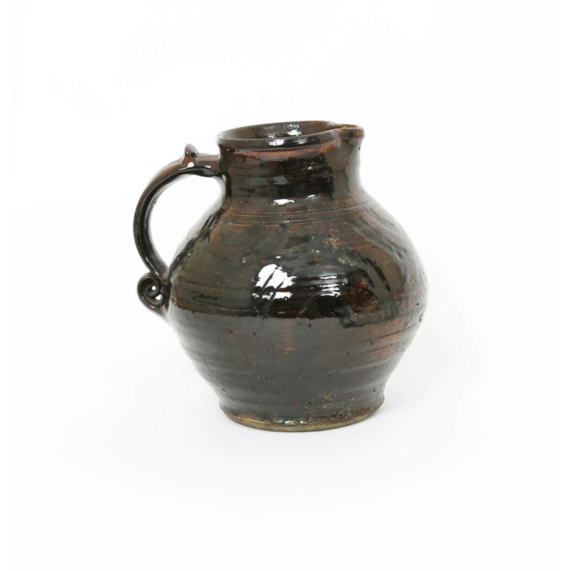 an Early pottery jug, ovoid with applied handle, painted in resist with geometric band in a treacle brown glaze impressed MC seal to base, minor glaze faults 20.5cm. high