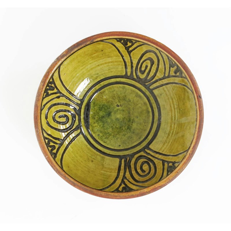 a Winchcombe Pottery slip decorated bowl, in brown on a green ground impressed seal marks 26.5cm. diam.