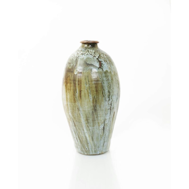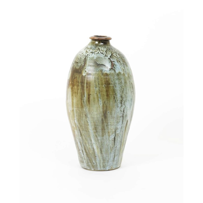 a Lowerdown Pottery vase, slender form with swollen neck and collar rim, covered in a running Dolomite glaze impressed seal mark to base, small chip to base rim, 45cm. high