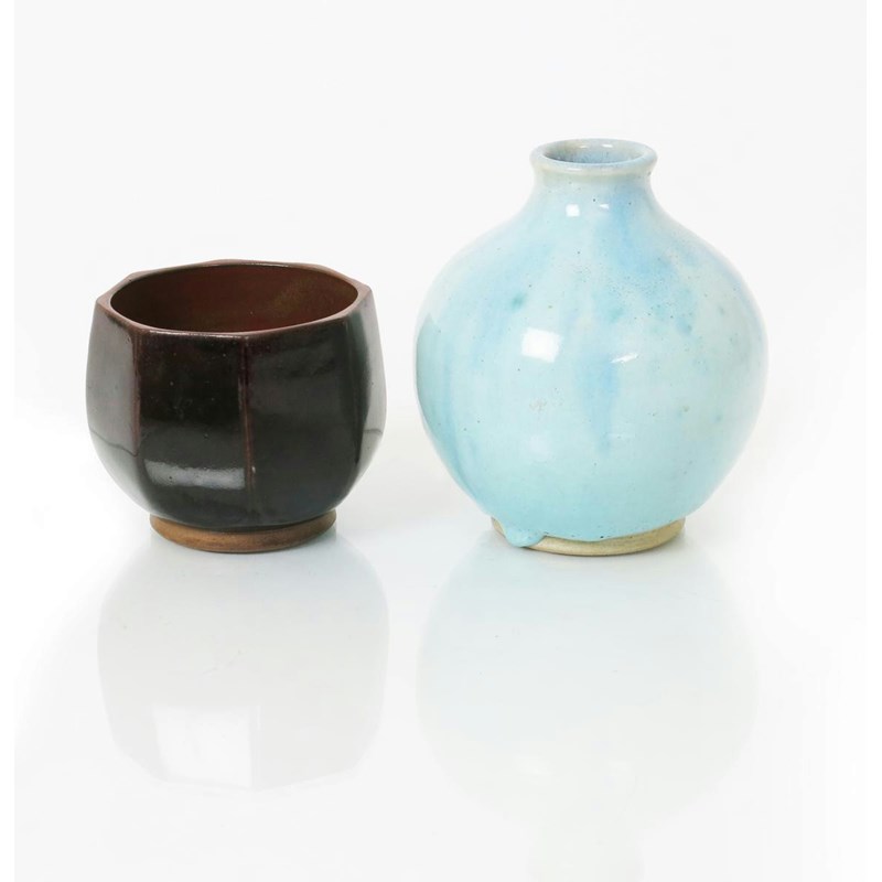 an ovoid stoneware vase, dated 1928, covered to the foot with a thick pale blue running glaze, and a Tenmoku glazed pot incised C Vyse 1928 15.5cm. high (2)