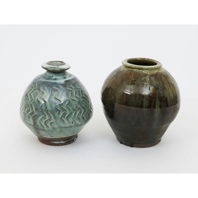 a stoneware vase, ovoid form with collar rim, decorated with zigzag motif, under an ash glaze, and another Mike Dodd vase similar impressed seal marks, 20cm. high (2)