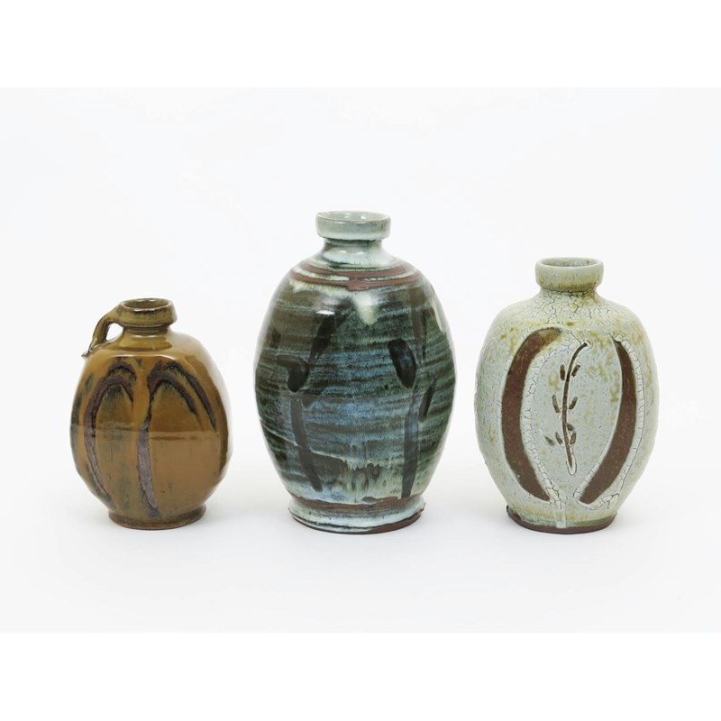 a shouldered stoneware vase, decorated in resist with a simple grass design under a thick celadon glaze, another Mike Dodd vase with loop handle decorated with a willow tree and another vase impressed seal marks, 24cm. high (3)