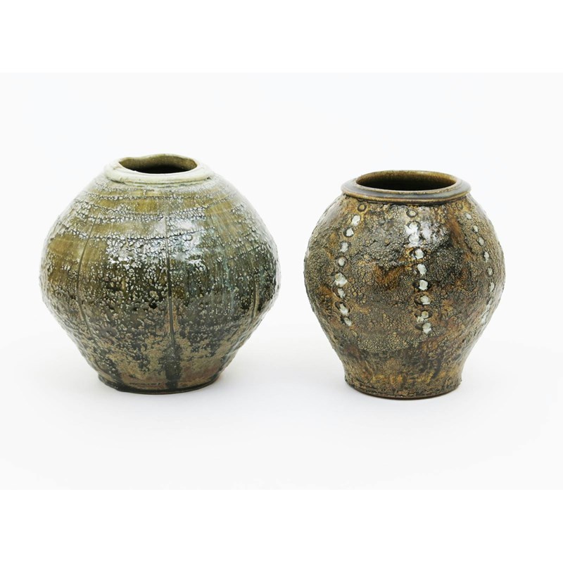 an ovoid stoneware vase, with fluted decoration, covered in a pitted celadon glaze, and another smaller impressed seal marks 23cm. high (2)