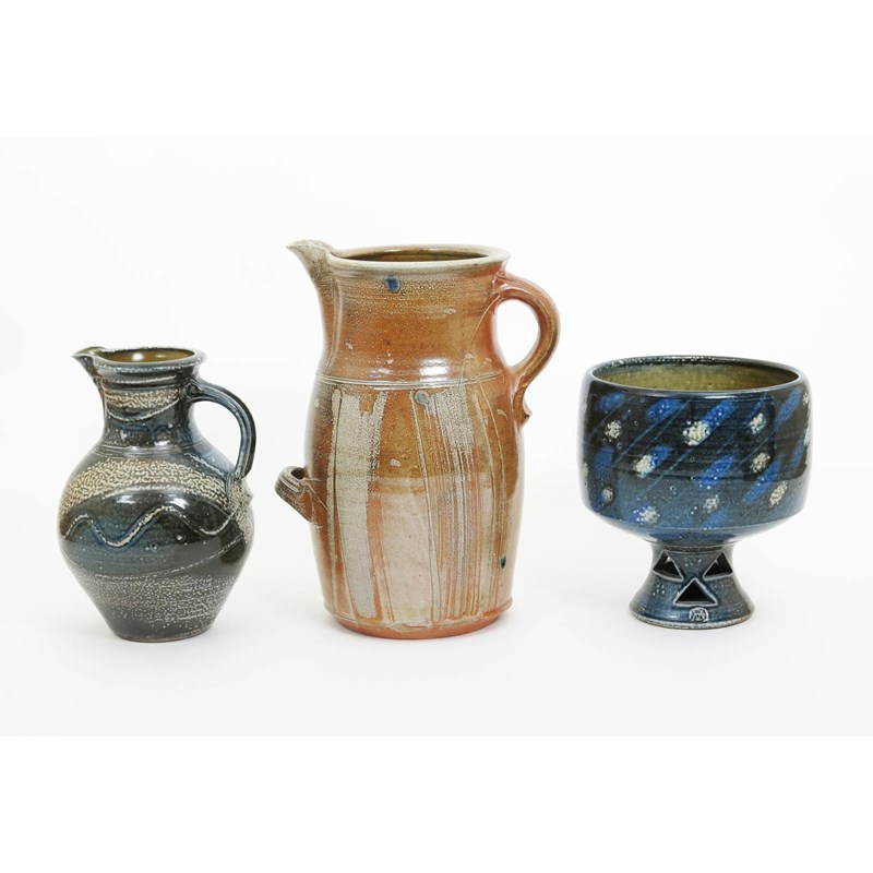 a tall salt-glaze stoneware jug, with incised design, a Michael Casson footed bowl and a jug impressed seal marks, 37cm. high (3)