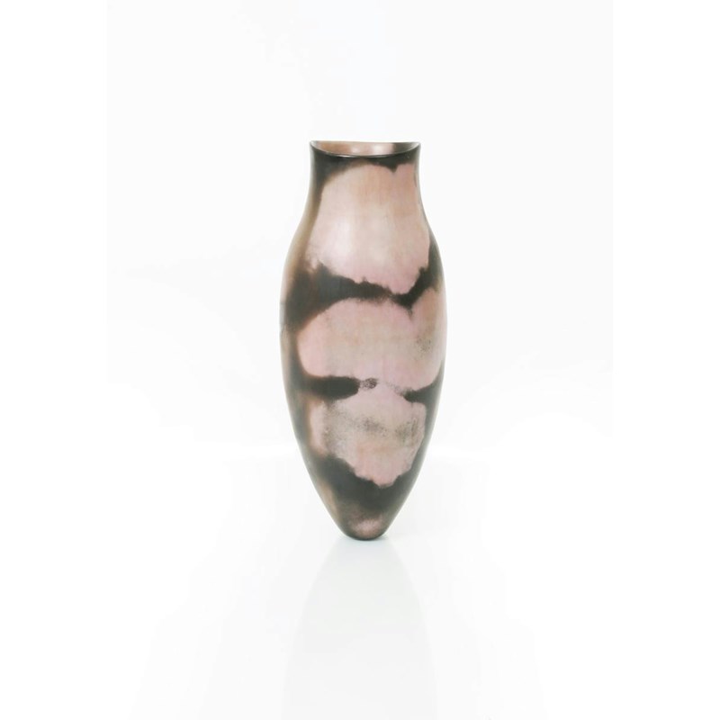 a tall burnished vase, slender form burnished black with pink patches incised Gabrielle Koch 32cm. high