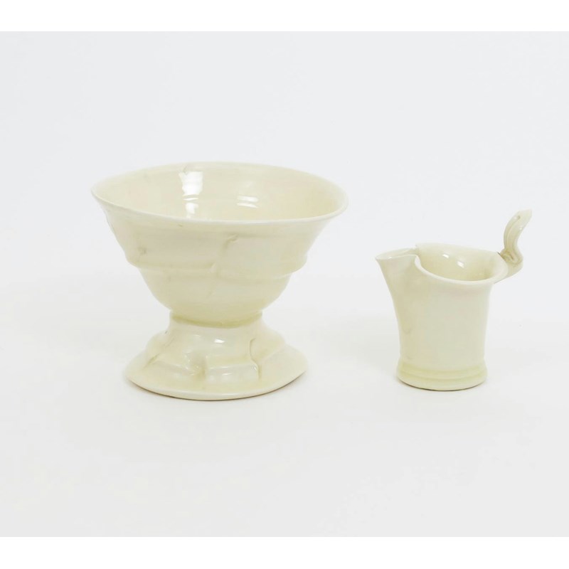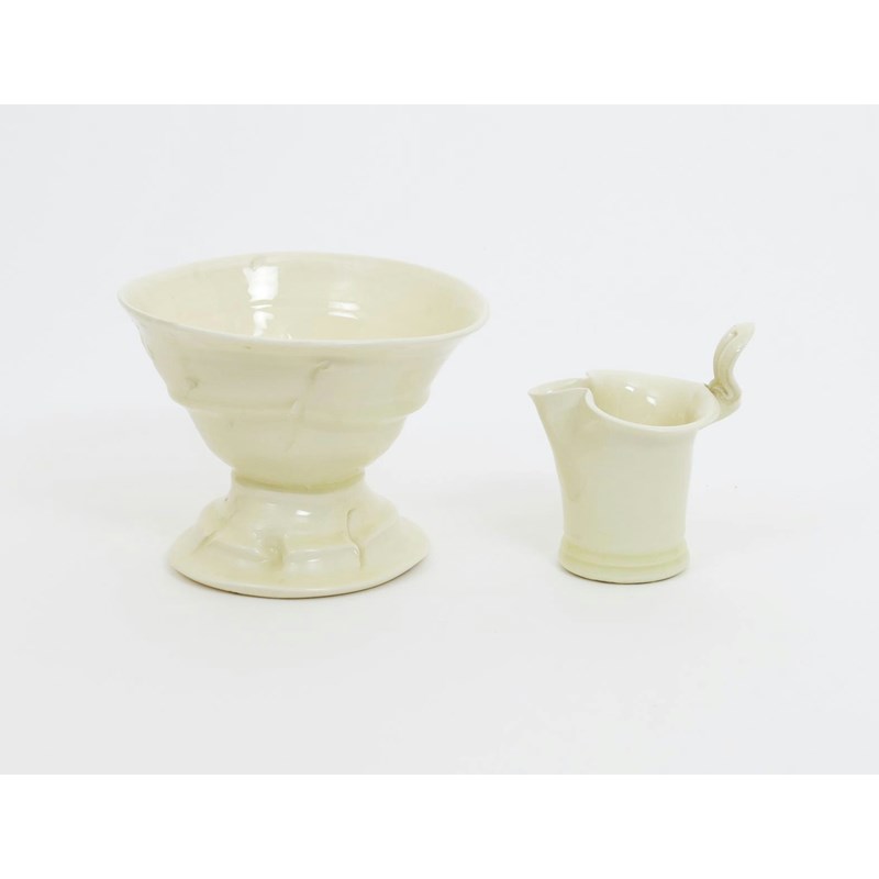 a footed earthenware bowl, irregular form, covered in a crackled cream glaze, and a Takeshi Yasuda small jug unsigned 17cm. wide
