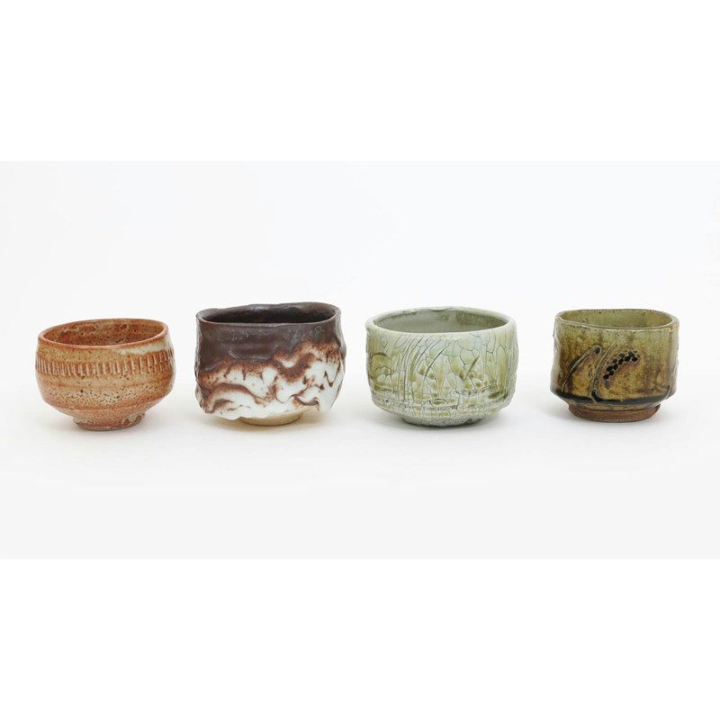 a stoneware unomi, incised with grasses, covered in a pitted ash glaze, another Mike Dodd Unomi, a Ken Matsuzsaki unomi and another impressed seal marks 12.5cm. diam.