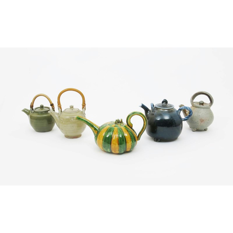 a Whieldon glazed gourd teapot and cover, glazed yellow and green, six other studio teapots and a collection of studio pottery impressed marks, unsigned 29cm. diam.