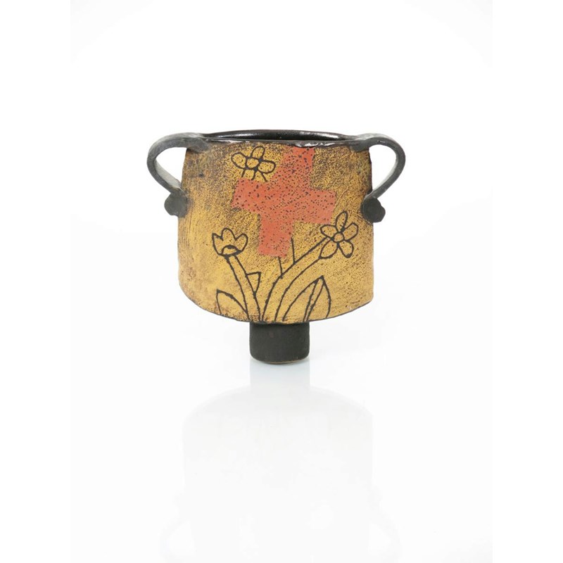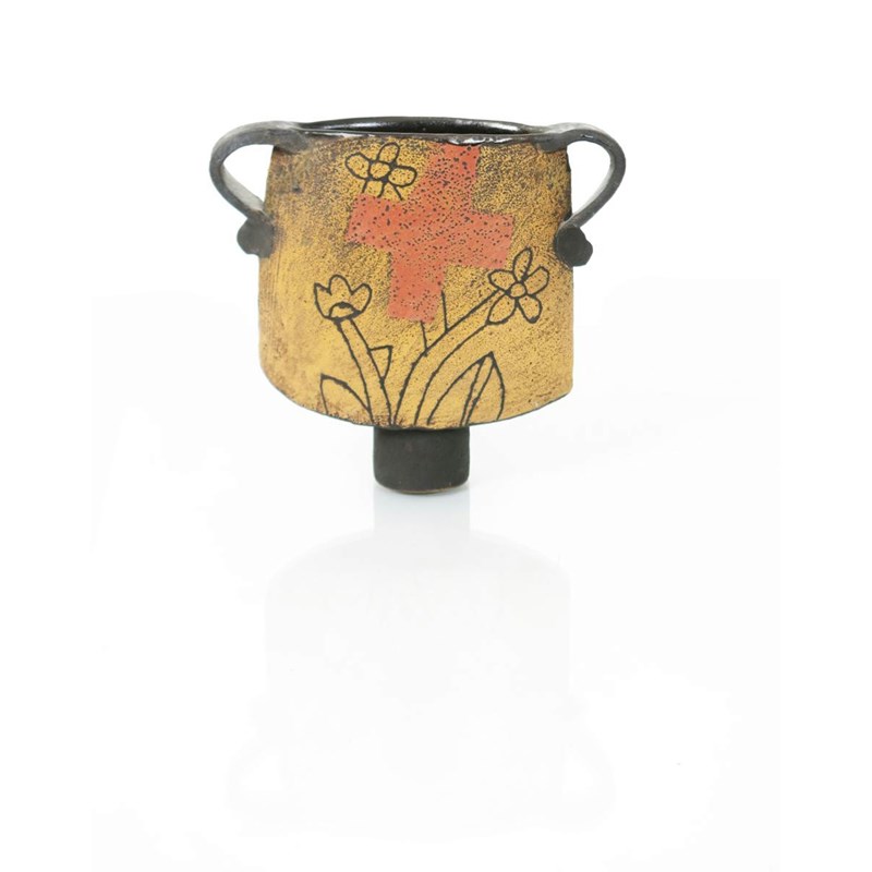 a stoneware twin-handled vase, enamelled with flowers and a red cross on a buff ground, the interior and reverse glazed back with red enamel splashes painted Maltby signature 17cm. high