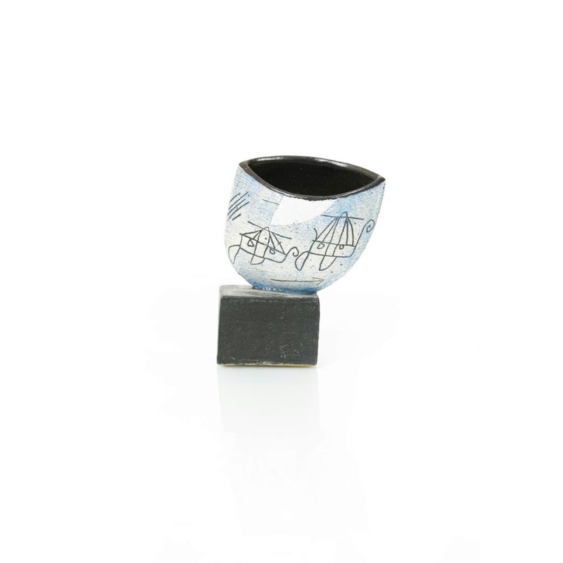 ‡John Maltby (born 1936) a stoneware cup form vase enamelled with ships at sea