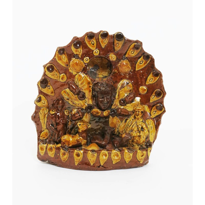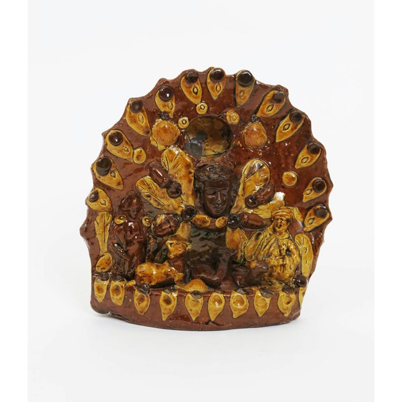 a rare hand-built pottery watch pocket stand, modelled with a shepherd resting with three sheep, the back modelled in relief with acorns, a mask, shells and geometric leaf motif, glazed in shades of brown and yellow, 23cm. high