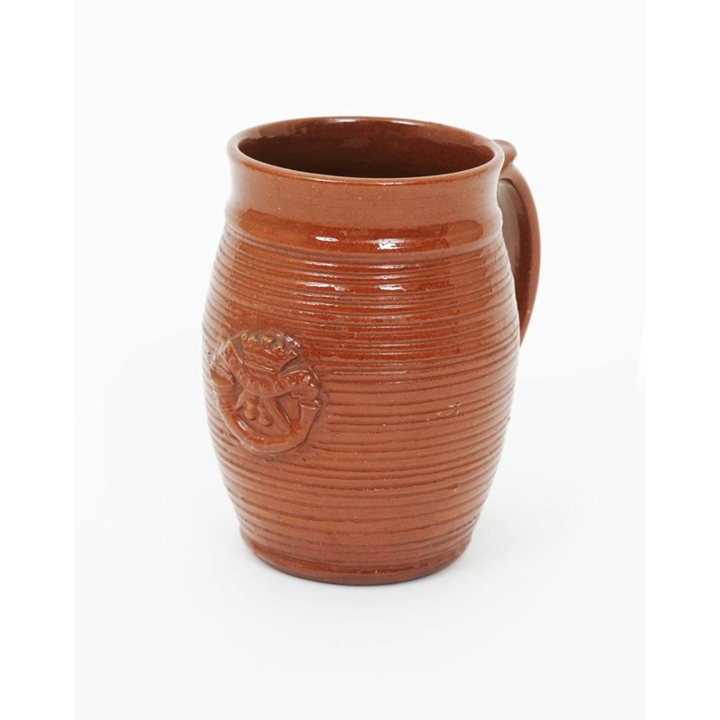 an early earthenware tankard possibly Leach Pottery, swollen barrel form with applied handle and Cornwall symbol, covered in a rust brown glaze impressed DL monogram 13.5cm. high