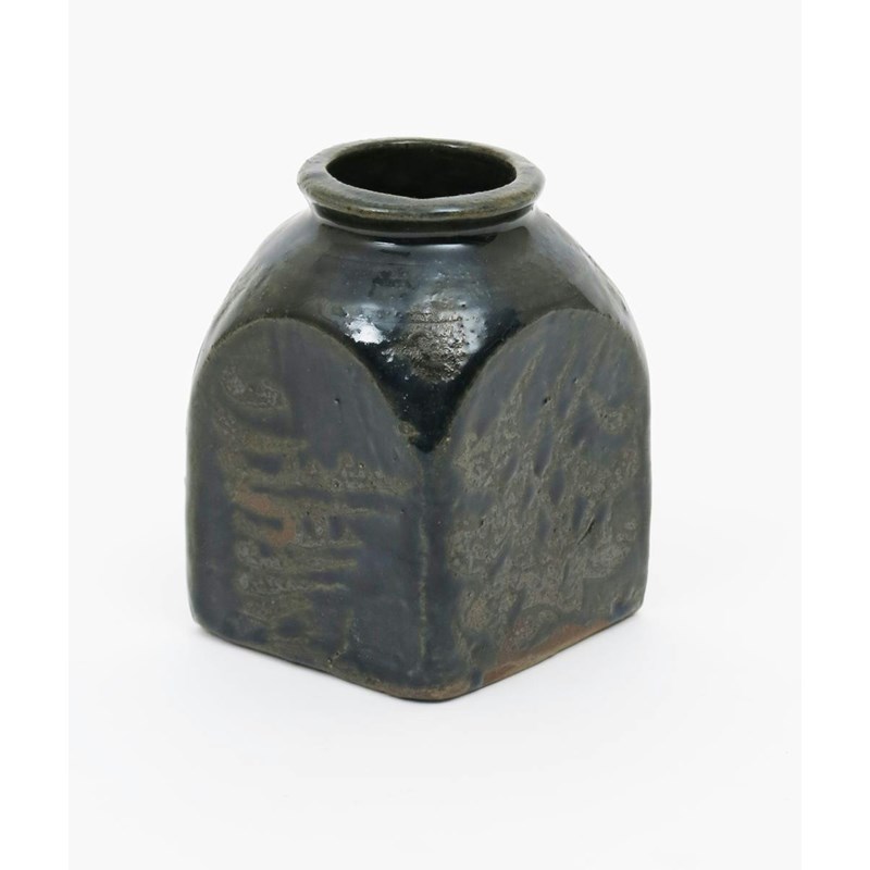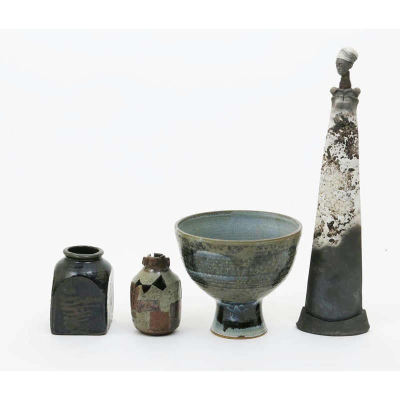 a Leach Pottery stoneware vase, square section with circular rim, resist decorated in green over brown wit a hatched design, a Janet Leach vase, a Vera Tollow bowl, a Raku figure and a stoneware bowl impressed BL and Leach Pottery seals, firing faults, damages to Janet Leach, 13.5cm. high (5)