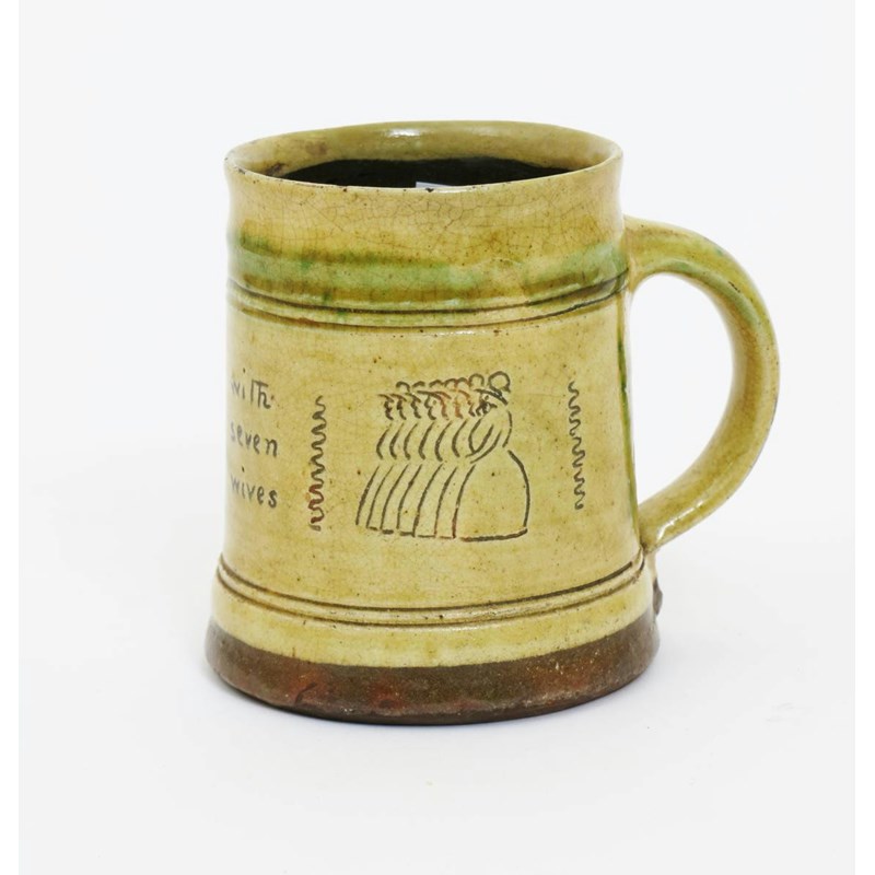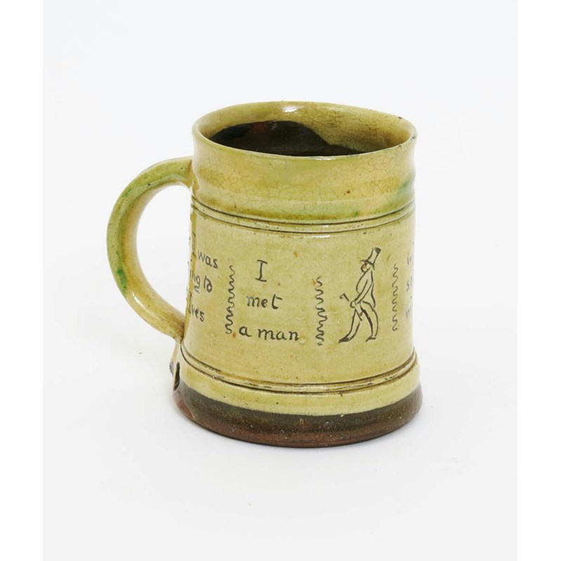 a Leach Pottery mug, covered to the foot with a pale yellow glaze, incised with proverb As I was going to St Ives, I Met a Man with Seven Wives and figures, impressed St Ives seal mark, minor glaze frits, 11cm. high