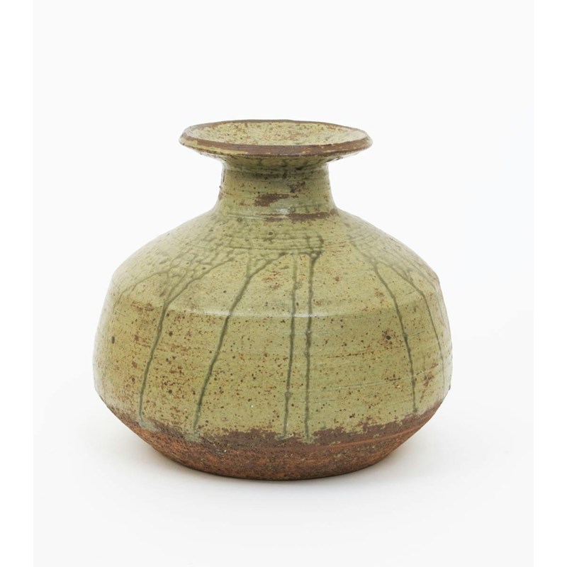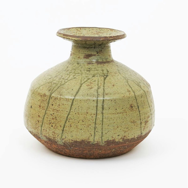 a Leach Pottery large and impressive stoneware vase, shouldered form, covered in a running ash green glaze impressed seal mark 33cm. high
