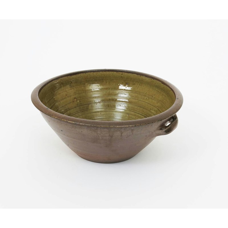 a flaring stoneware bowl with twin-handles, glazed to the interior with ash glaze unsigned 43cm. diam.