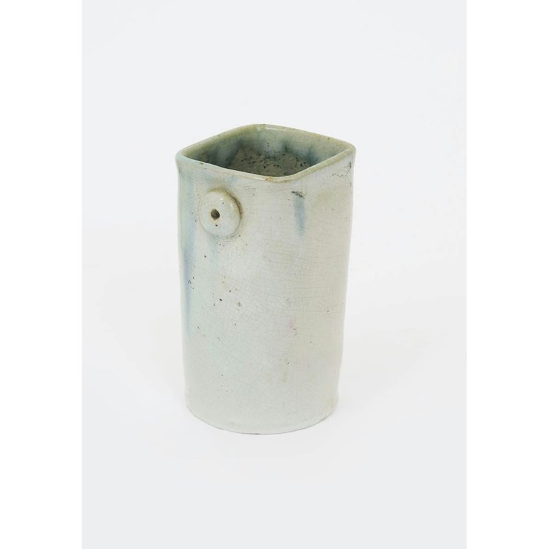 a rare Mortlake Pottery vase, cylindrical form with applied roundel, covered in a pale celadon glaze incised GJC monogram, M 1912, 10.5cm. high