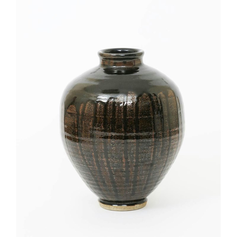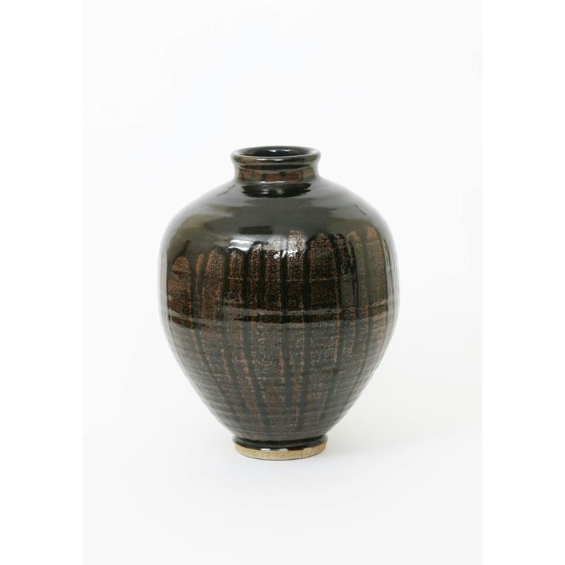 a tall stoneware vase, covered in a running tenmoku glaze impressed seal mark, 35cm. high