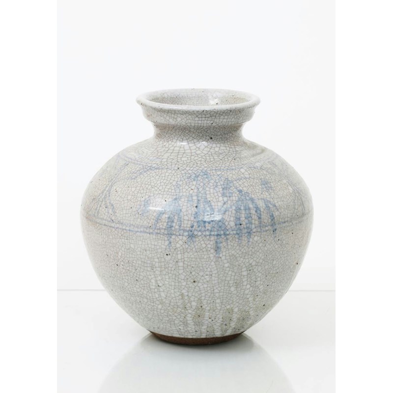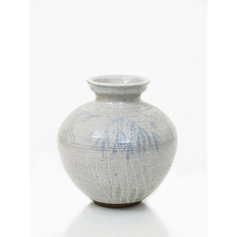 a crackle glazed stoneware vase, ovoid, shouldered form with everted rim, painted with a frieze of bamboo stems in blue on a light grey crackled glaze to the foot, unsigned 27cm. high