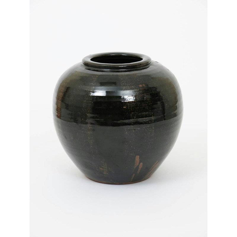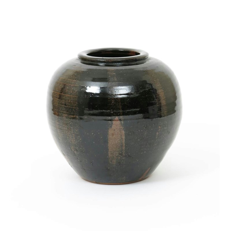 A stoneware vase, shouldered form, covered in a running tenmoku glaze, impressed mark 25cm. high