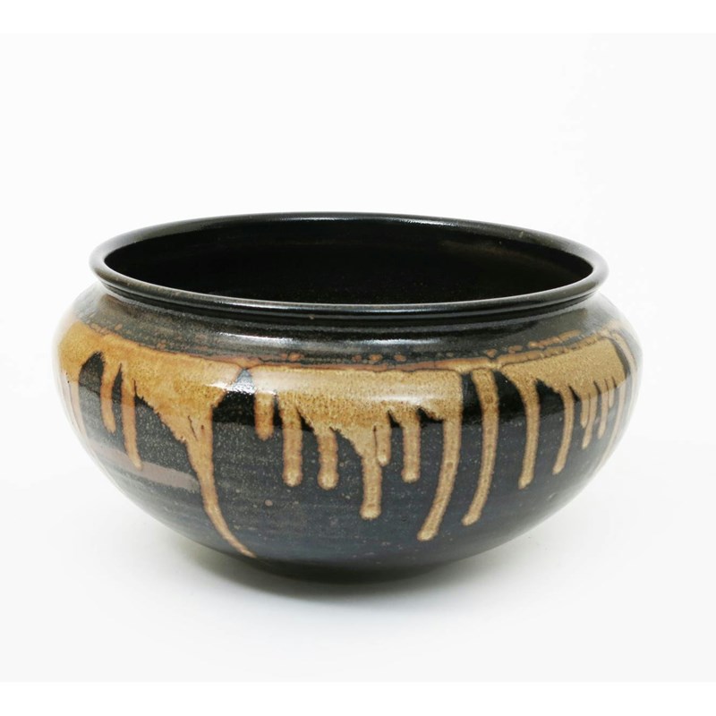 a stoneware ovoid vase with everted rim, covered in a running tan glaze over tenmoku, unsigned 35cm. wide