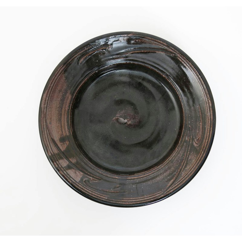 a stoneware charger, incised with simple stroke design, covered in a tenmoku glaze, impressed seal mark, 34.5cm. diam.
