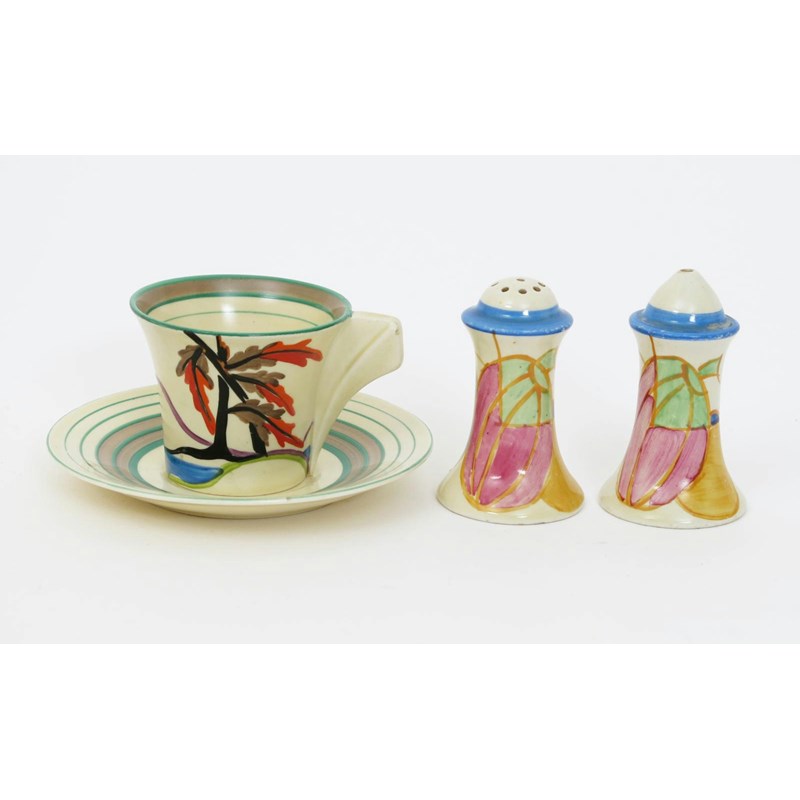 'Coastal Oak' a Clarice Cliff Bizarre Daffodil cup and saucer, painted in colours, and a Pastel Melon salt and pepper printed factory marks, cup restored 7cm. high (3)