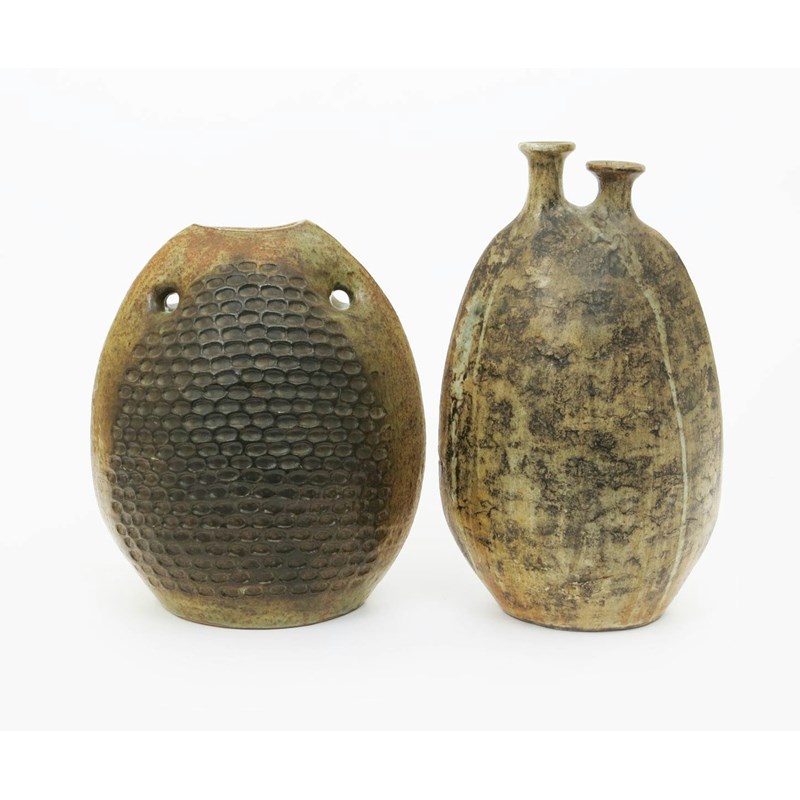 a large stoneware vase, dated 1969, amorphic form with twin necks, covered with a running ash glaze, and another by the same artist, painted signature and date 44cm. high