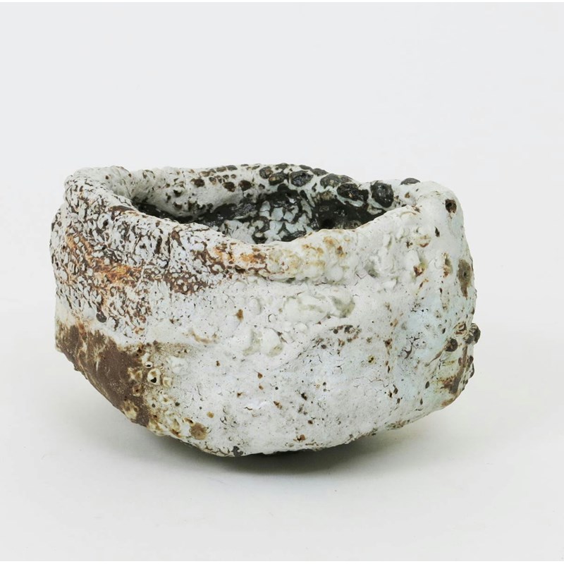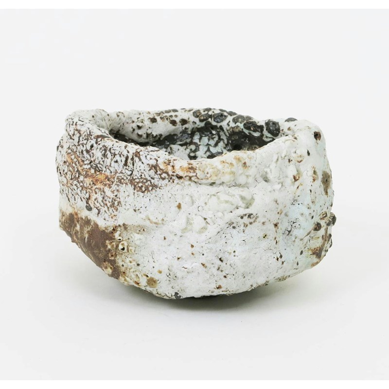 a stoneware unomi, irregular form, covered in a volcanic glaze and porcelain slip, 13cm. wide.