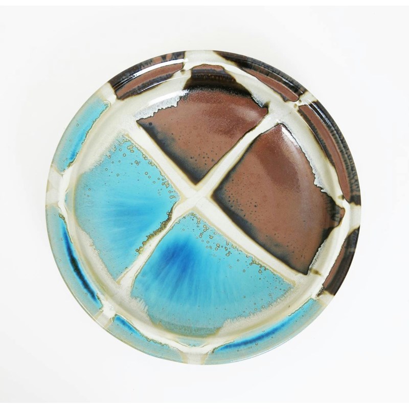 a large stoneware charger, resist decorated in blue, brown and white glazes on a celadon ground unsigned 41cm. diam.