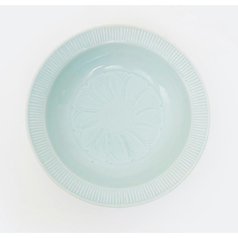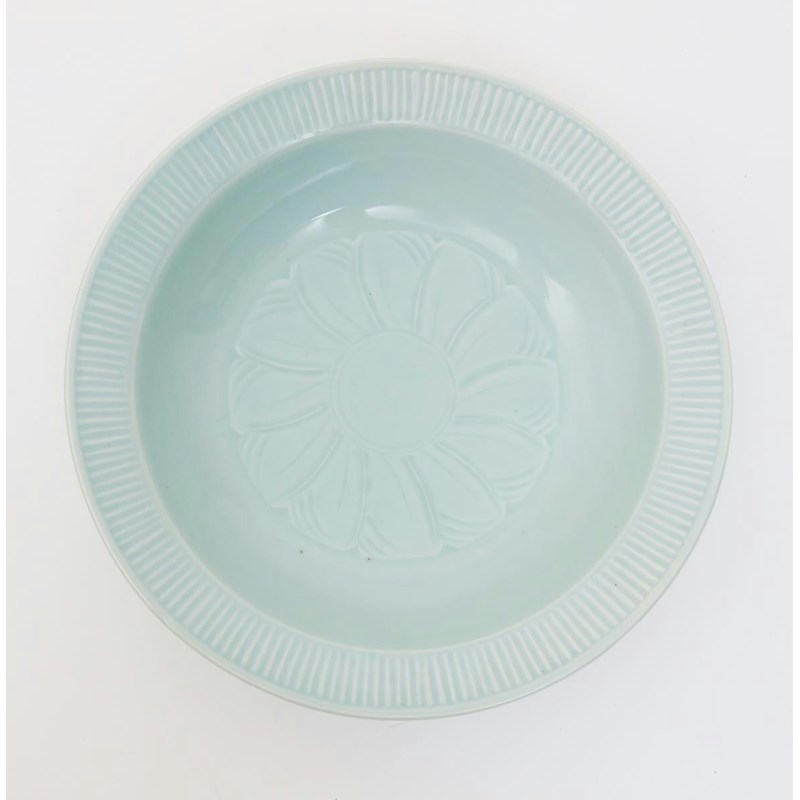 a porcelain bowl incised with a flower roundel, covered in a celadon glaze impressed seal mark, 32cm. diam.