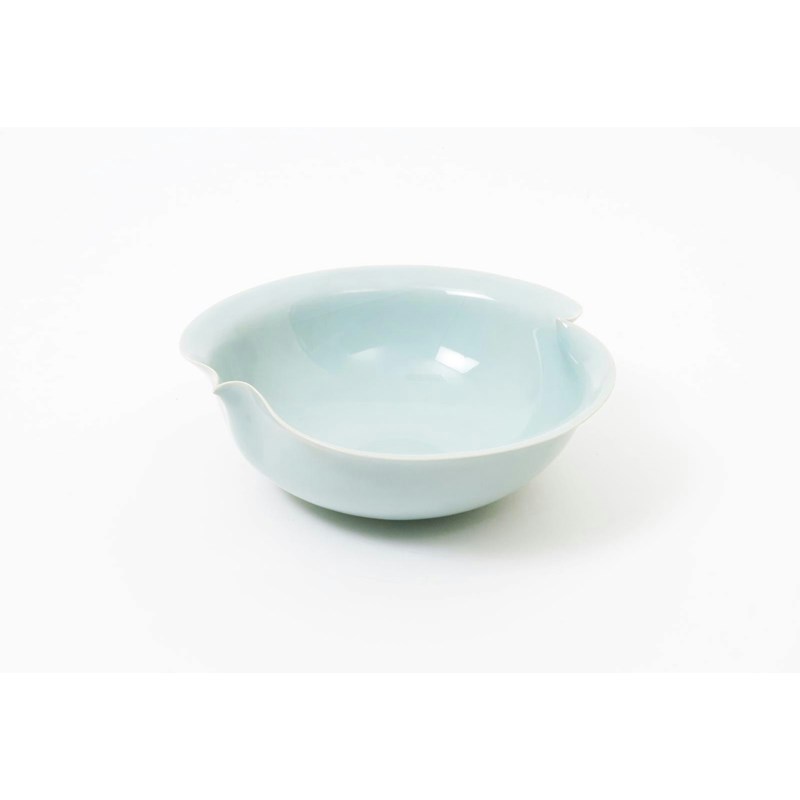 a porcelain bowl with pinched rim, covered in a celadon glaze, with original fitted box, signed to the underside of the box lid, re-stuck chip to rim 23.5cm. diam.
