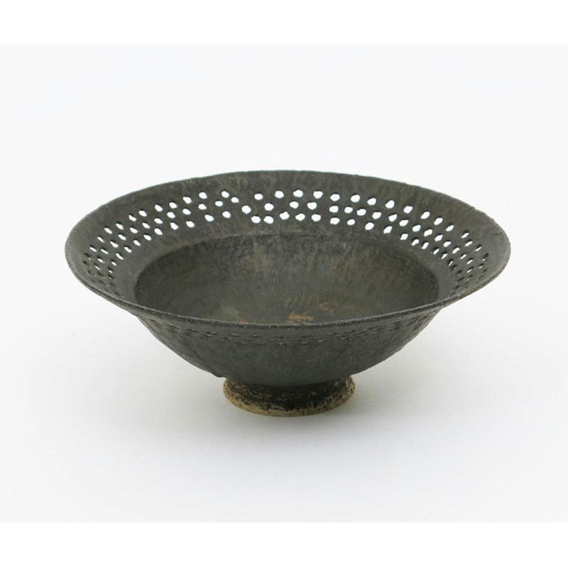 a stoneware bowl, the rim with pierced rim decoration, covered to the foot in a bronze glaze unsigned, firing cracks to pierced band 24cm. diam.