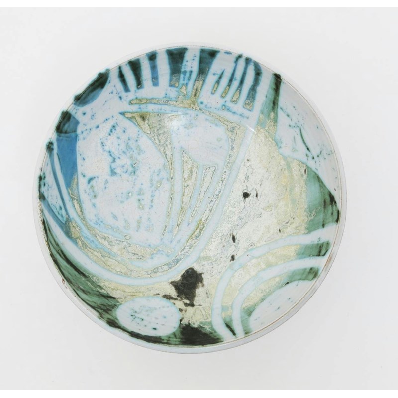 an early terracotta footed bowl, decorated in resist with abstract design in the style of the Picassoettes, incised signature 17cm. diam.