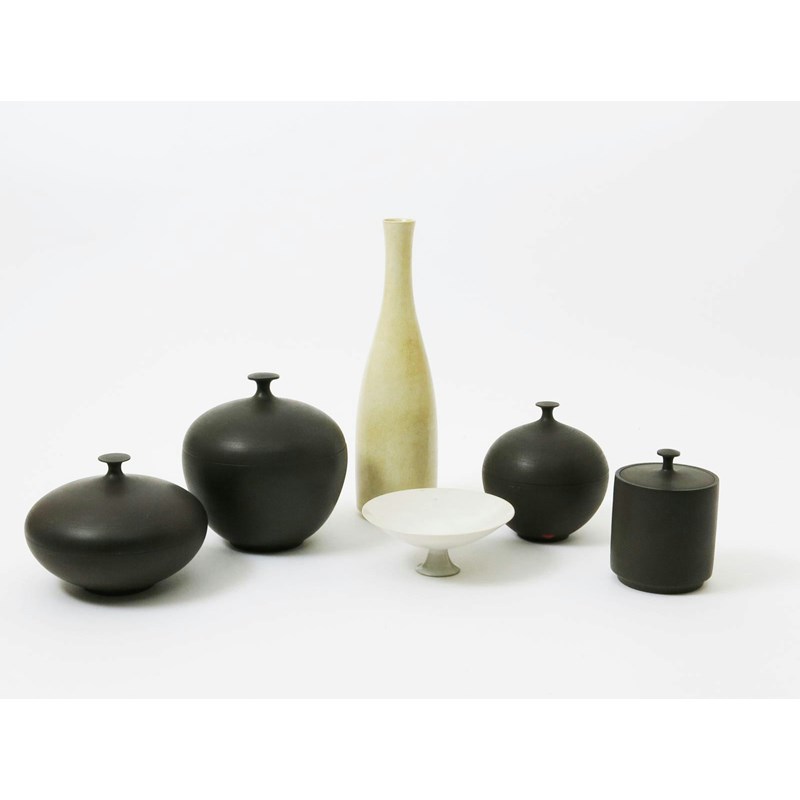 a solifleur vase, covered in a pale ochre hare's fur glaze, a pedestal bowl and four matt black box and covers etched monogram, chip to rim of one box 29cm. high