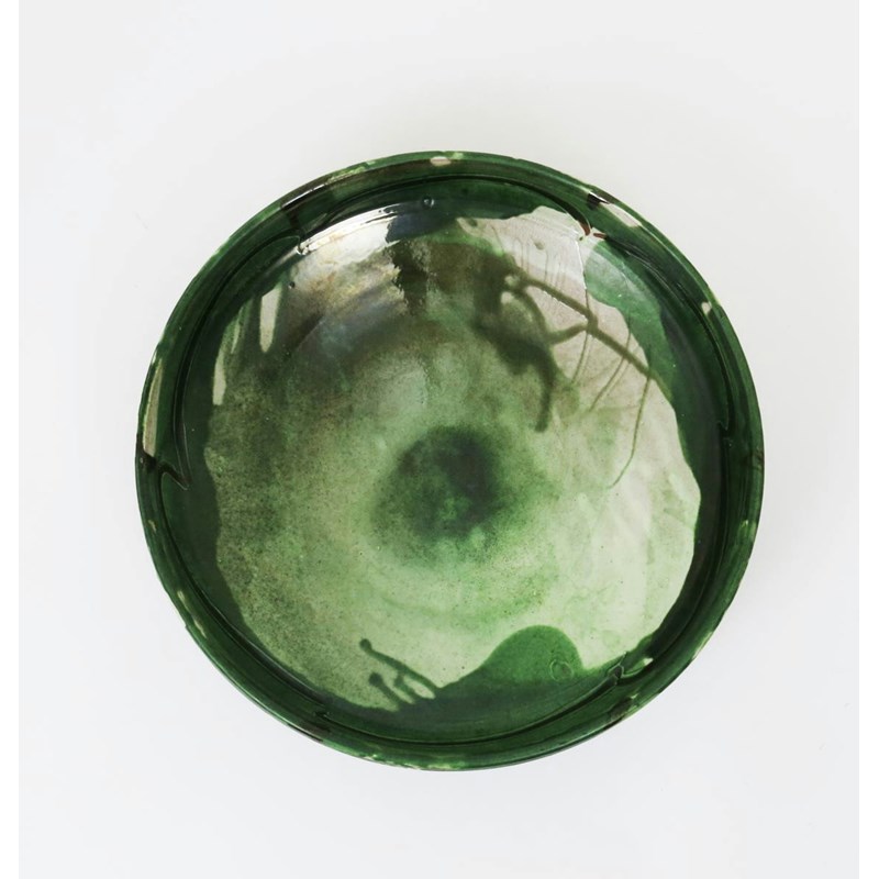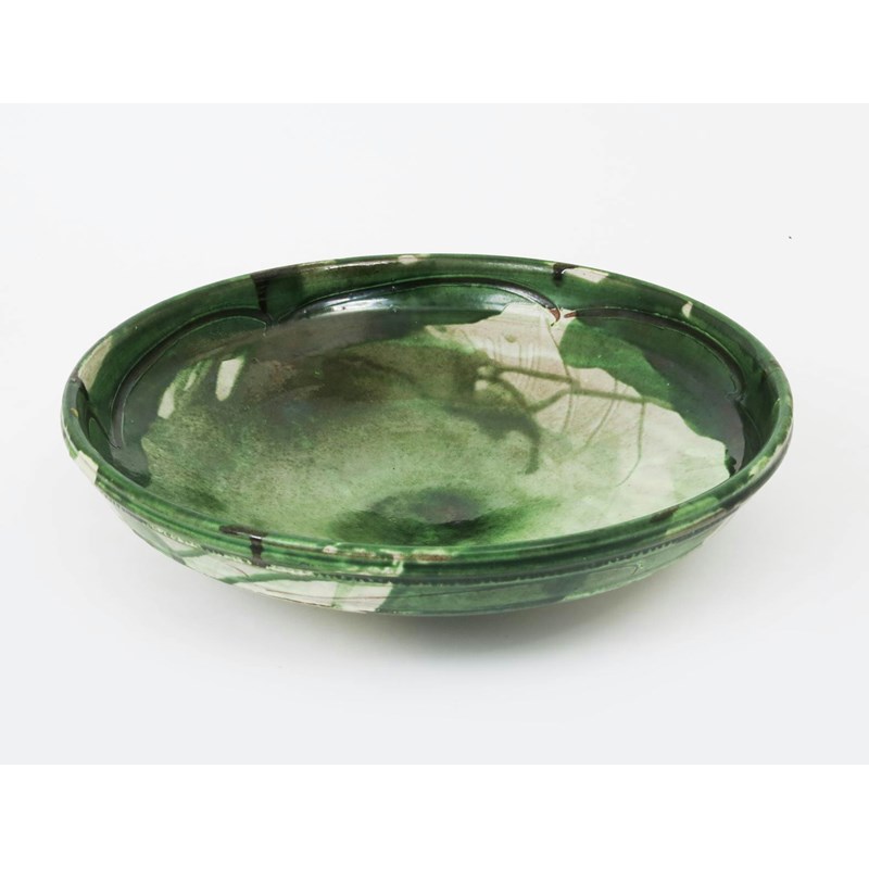 a large flat earthenware bowl, slip decorated with white under a brushed green glaze 43.5cm. diam.