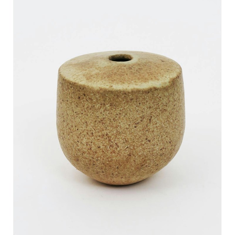 a hand built stoneware vase, shouldered form covered in an oatmeal glaze impressed seal mark, 11cm. high