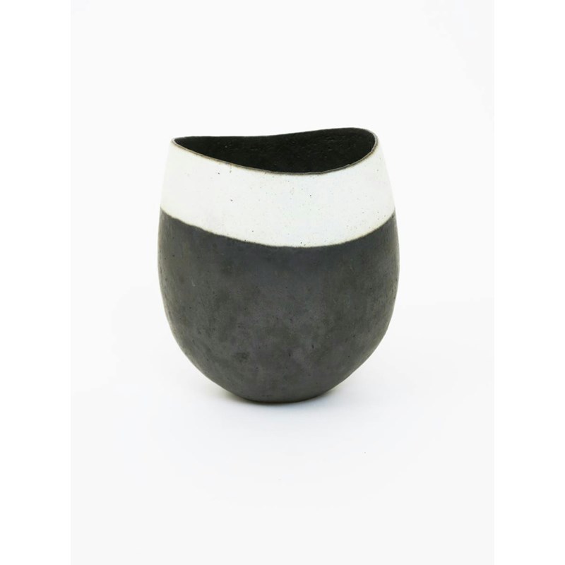 a hand built stoneware vase, slender from with pulled up rim, glazed with broad white stripe to top rim, over black ground impressed seal mark, 19cm. high