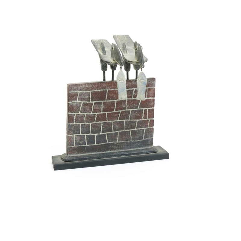 Two Birds and Wall, a large sculpture group, on wooden base signed and titled to base, paper label to base, 36cn, high, 35cm. wide