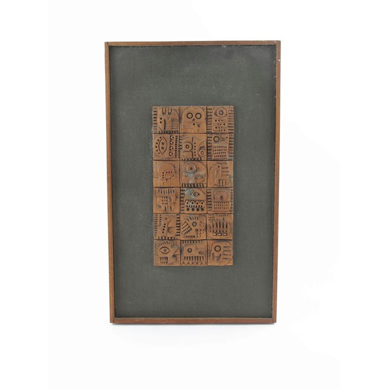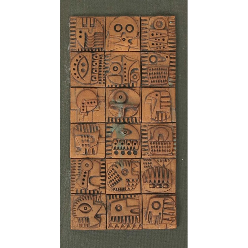an eighteen tile panel, each cast in low relief with geometric design, glazed copper-bronze, framed, signed Ron HItchens to the reverse, 51.5 x 31.5cm.