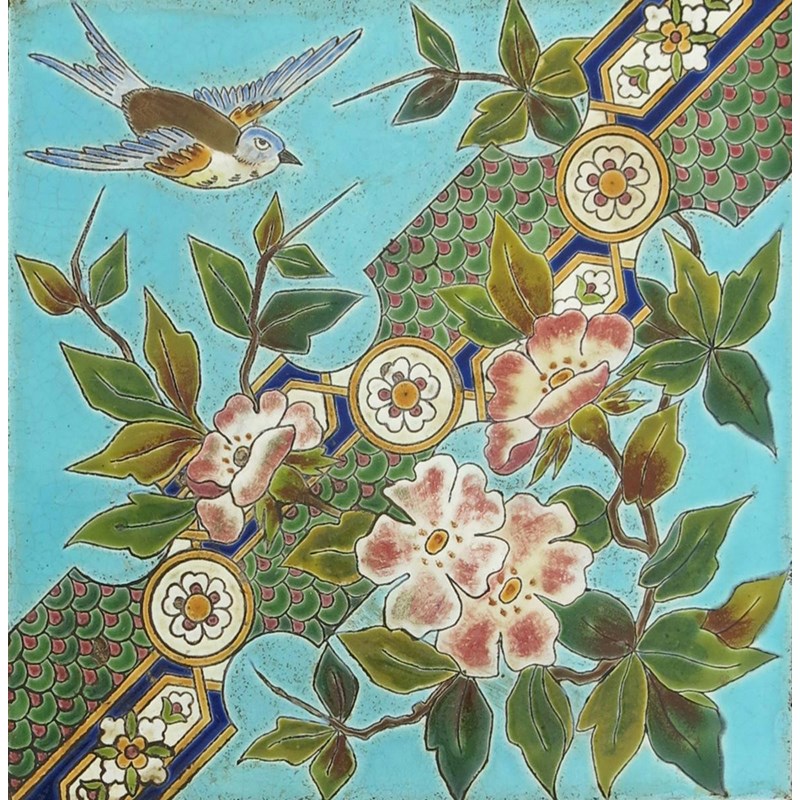 A Longwy Pottery Aesthetic Movement tile, enamelled with a bird flying past flower stems and a geometric border, in colours on a turquoise ground, mounted in wooden stand and nine English tiles printed with a floral design, Longwy tile 21cm square, stand 29cm. square