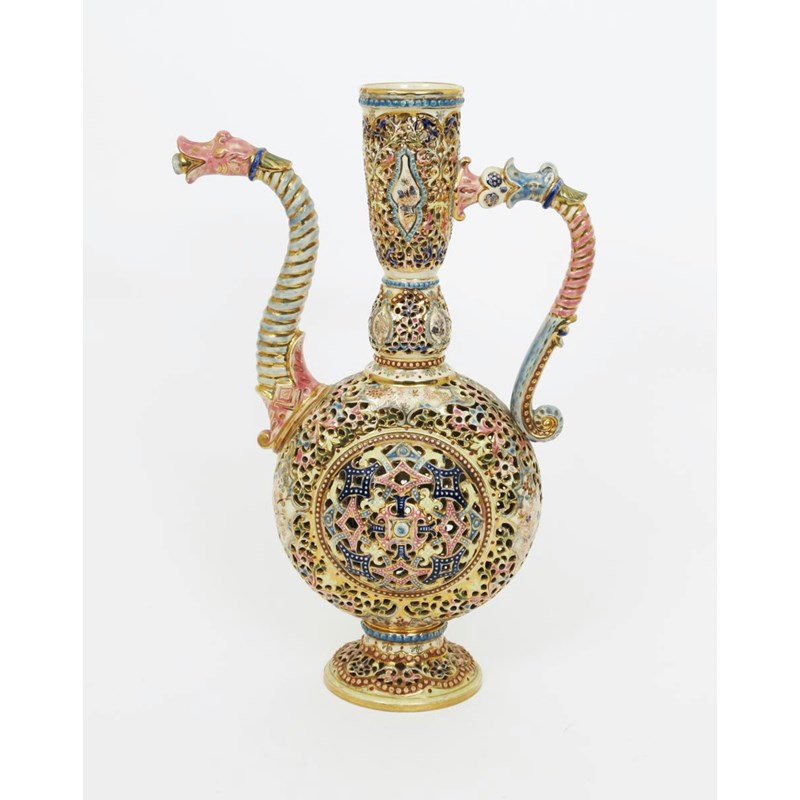 A large Fischer Hungarian pottery ewer, pierced form, the scrolling spout and handle with grotesque mask terminals, in colours on a cream ground, highlighted in gilt, stamped mark to base 46cm. high