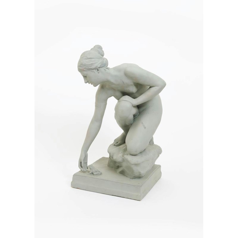A tall terracotta sculpture of a woman crouching cast from a model by Emil Caver, dated 1903, modelled crouching to pick up a frog, painted grey signed in the cast and dated 60cm. high