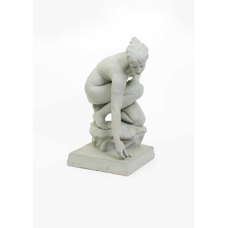 A tall terracotta sculpture of a woman crouching cast from a model by Emil Caver